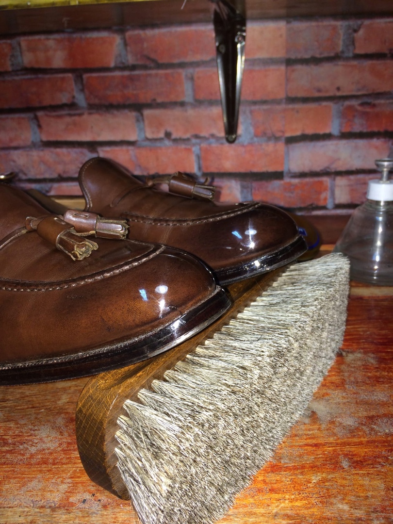 Глассаж представляет собой процесс многократного нанесения гуталина и воды на носочную и пяточную части обуви до появления зеркального блеска.